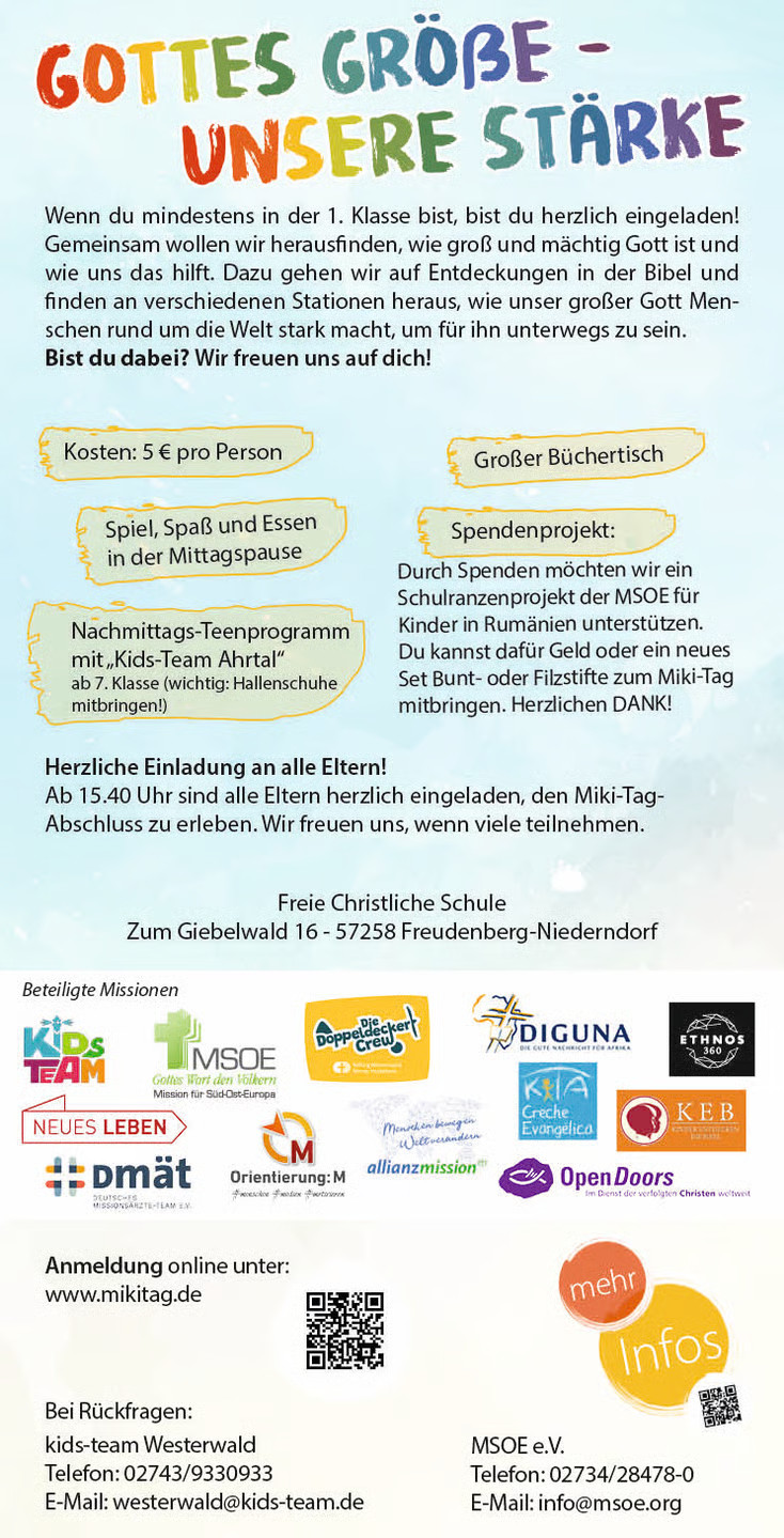 Der MiKiTag ist ein Tag voller Action, Spiel und Gemeinschaft für Kinder, an dem sich alles um das Thema Mission dreht. Wir reisen um den Globus und entdecken: Wie ist die Welt in anderen Ländern? Wie leben Kinder dort? Auch wir von Orientierung: M arbeiten wirken an diesem Tag mit und stellen unsere Arbeit in Deutschland vor.